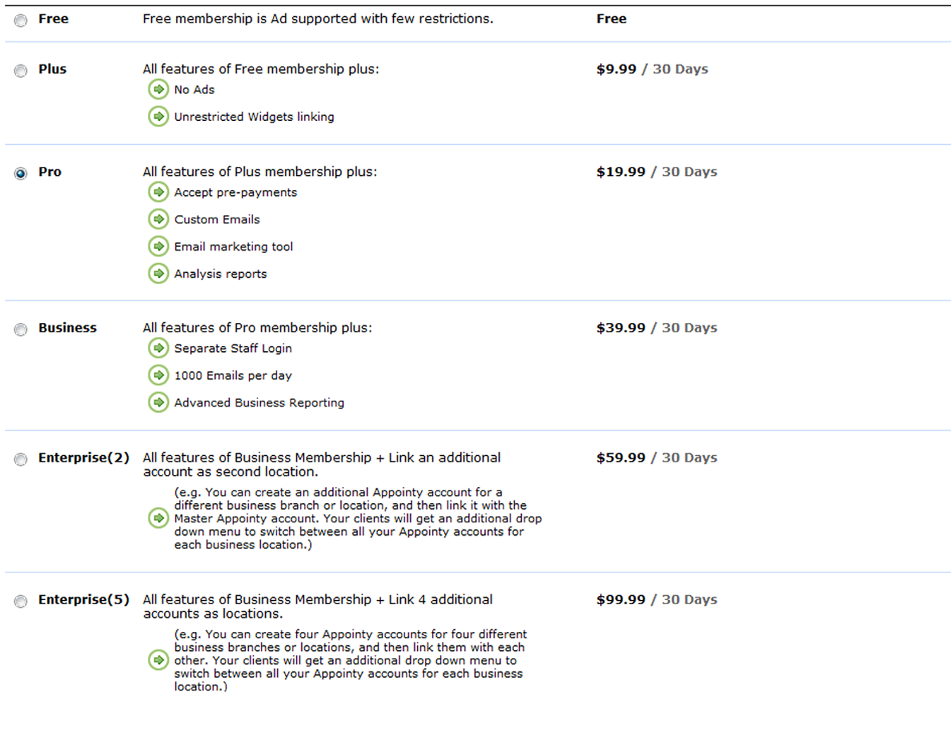 - Pro Membership ($29.99/month) is good for small sized businesses that require more advanced scheduling options, like pre-payments, email marketing, email customization etc.